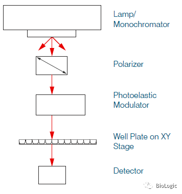 这项圆二色CD技术的突破是通过将一般圆二色CD光谱仪的光路配置进行转换完成的。在传统CD(卧式)中,光路的配置使得光束水平穿过装满溶液的比色池。通过将光路垂直配置,CD Microplate ReaderTM圆二色谱微孔板检测仪/酶标仪可以直接测试孔板中的样品溶液。通过XY运动台进而可以移动孔板测试所有孔的样品。