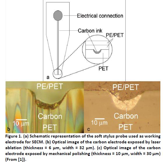 柔性微电极探针是由Salazar[1]等人发展起来的,用来实现粗糙、倾斜、较大的基体在接触模式下的SECM。先在聚乙烯对苯二酸酯薄膜中烧蚀一个微通道,然后用导电的碳墨填充。用聚合物膜固化碳轨道和叠片之后,切出V型针,从而形成探针。通过UV光切割或者刀片切割,露出碳轨道尖端的横截面,抛光产生一个新月形的碳微电极[1]。