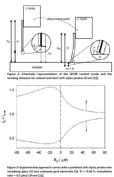 这些柔性探针压在基体上时可以弯曲,这样聚乙烯对苯二酸酯层一直通过弯曲接触。这个聚乙烯对苯二酸酯层的厚度定义了基体和活性电极区域的固定工作距离。当扫描粗糙表面时,探针的弯曲可以适应形貌特征,因此可以不需要额外的电反馈系统(像AFM系统中)保持一个几乎固定的工作距离,甚至可以提供那些太粗糙以至于无法AFM成像的表面的图像[1]。