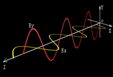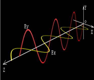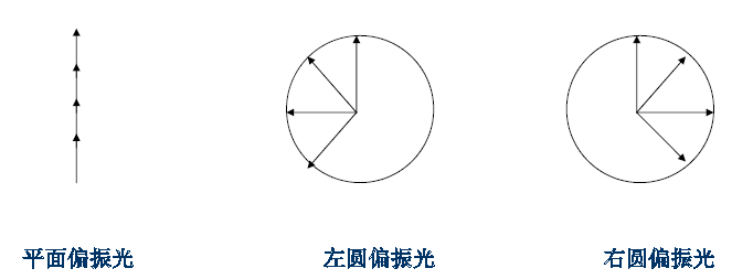 2、圆偏振光:对着光前进的方向观察时,一束光波的电场矢量(或磁场矢量)端点在空间的轨迹是以光传播方向为轴的圆形螺旋(在平面上的投影为圆形)。电矢量方向沿逆时针方向旋转,称为左圆偏振光;电矢量方向沿顺时针方向旋转,称为右圆偏振光。