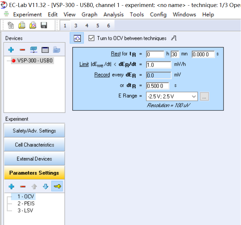 用户在第一次实验时,需要按照需求,在EC-Lab中添加所需的实验,并对每个实验进行参数设置。以一般的腐蚀测试为例,下图为一个样品需要进行的一系列测试,先做一个OCV,然后是EIS测试,最后是LP测试。