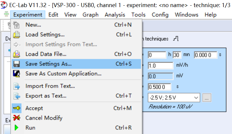 电化学工作站EC-Lab软件有很多功能为用户的实验提供便捷,本文介绍一个重复实验的技巧——保存实验设置。具体的步骤方法如下: