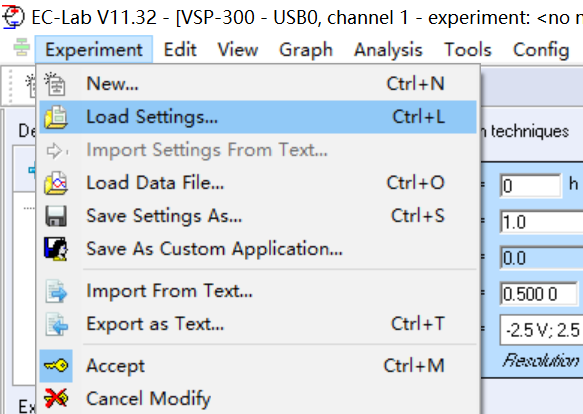 还是以上面的腐蚀实验为例,调用实验设置的方法为:EC-Lab软件中Experiment→Load Settings...→弹出打开文件路径对话框→选择上次保存的参数设置文件即可。这样一步操作,就可以直接添加了OCV、EIS、LSV实验,并且实验参数设置也与上次实验的设置一致。如果实验参数或者实验方法需要调整,可以直接更改。或者保存多个实验设置,每次需要做哪个类型的实验,就直接调用该类型的实验设置即可。