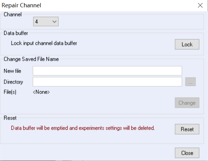 这部分用于选择需要修复的通道序号,尤其多通道电化学工作站,一定要在需要修复的通道下,选择Repair Channel菜单,然后在此部分还要选择需要修复的通道序号。而且修复通道时,一定不可以更改工作站与电脑的连接方式。(之前是网线连接就一定还要保持网线连接,之前是USB连接就一定还要保持USB线连接。)
