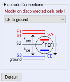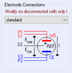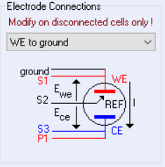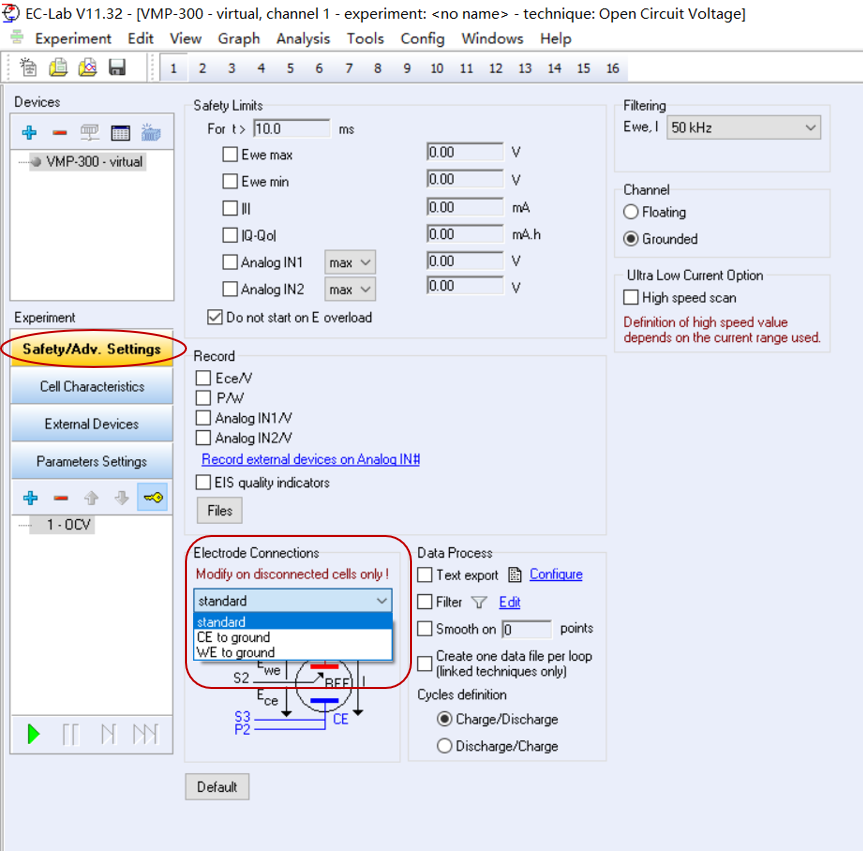 EC-Lab软件中,添加实验后,在左侧Safety/Adv. Settings下有一个Electrode Connections部分,其中可以选择standard、CE to ground、WE to ground或者其他大电流仪器的连接方式(如下图)。
