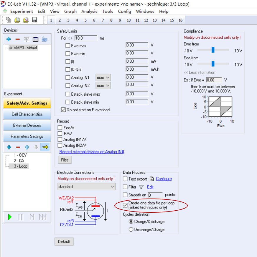 然而,为了更方便的处理数据,有些用户可能希望将每一圈的数据都分开保存为一个文件。在EC-Lab文件中可以实现这个功能。如下图,以EC-Labv11.32为例,在Safety/Adv. Settings下的Data Process部分,选择Create one data file per loop(linked techniques only)。选择该选项后,上面列举的实验结束后,存储的实验数据为20个.mpr文件:10个OCV实验数据,10个CA实验数据。