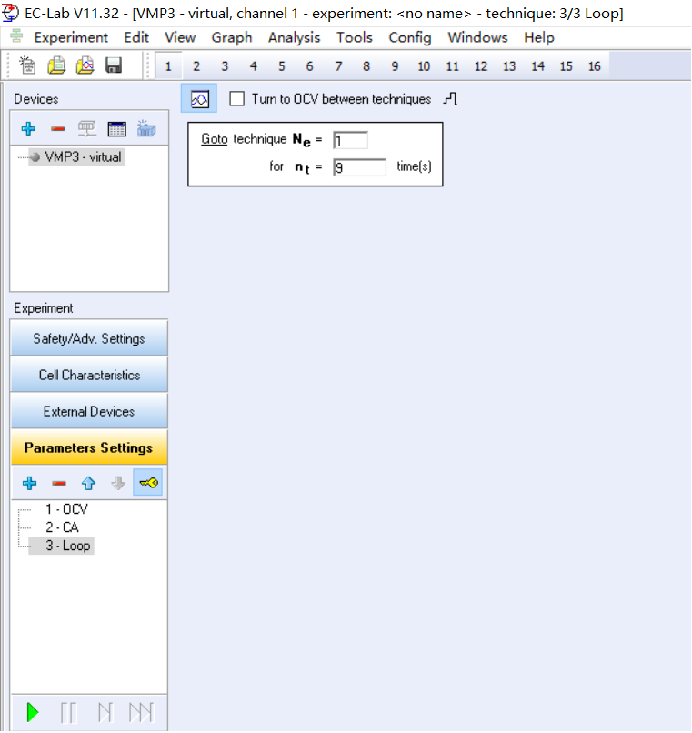 比如,在某个实验中,需要先运行一个OCV,然后运行CA,然后运行Loop到OCV实验9次。如下图。