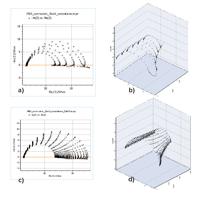 图5:a)腐蚀电极的Nyquist图表示的连续阻抗图;b)作为时间函数的相应3D显示;c)由20个横截面的“Z Inst”工具获得的瞬时阻抗的Nyquist图;d)作为时间函数的相应3D显示