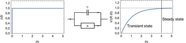 图1:R/C电路(中间)对电流阶跃(左)的电位响应(右),说明系统的稳态。
