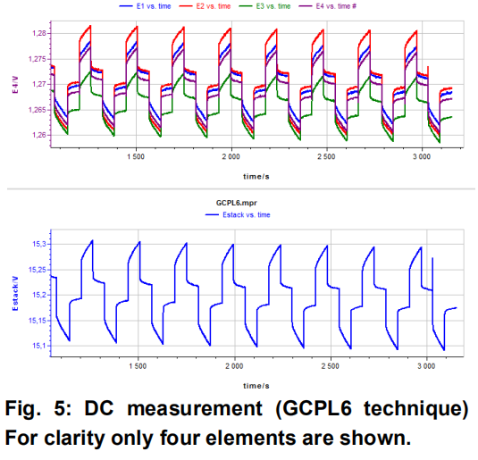 关于直流测量,下图Fig.5为GCPL6测试方法的结果。各元件的电位曲线显示于上面曲线,整个模组的电位曲线显示于下面曲线。