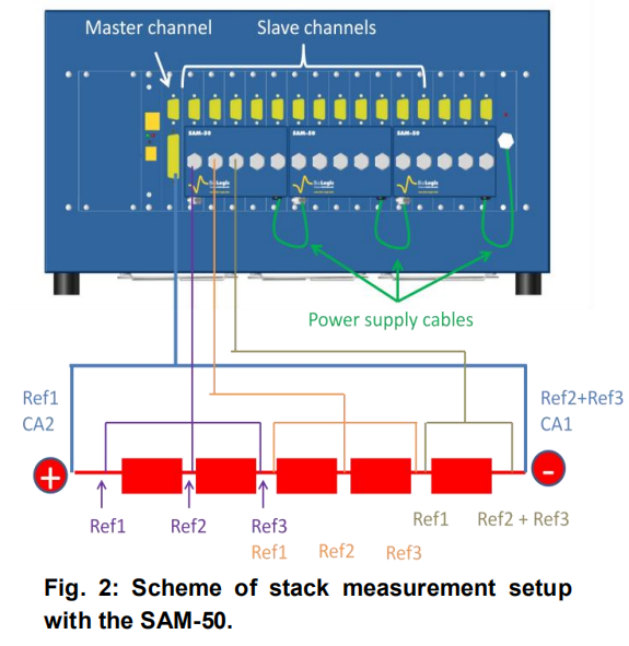 每个连接至SAM-50的通道均可测量两个模组元件的电位(ΔE1=Ref1-Ref2,ΔE2=Ref2-Ref3)(ΔE1为元件1电位,ΔE2为元件2电位)。所以,16通道的多通道电化学工作站(1个主通道,15个从通道)连接3个SAM-50,即可测量30个元件组成的模组。