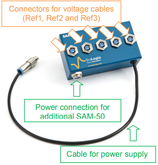 Fig.1:SAM-50介绍。橘色:电位测量连接方式;绿色:电源连接方式。