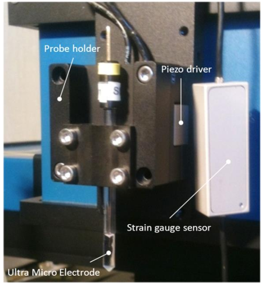 固定器连接压电驱动器(该压电驱动器也用于SVP和SKP实验)。压电驱动器驱动探针通常在低频(100-600 Hz)和小振幅(100 nm-4 ?m)振动。压电驱动模块(图1)有两条连接线,一条用于输入交流信号,驱动压电装置,另一条用于通过应力测量传感器测量振动振幅。