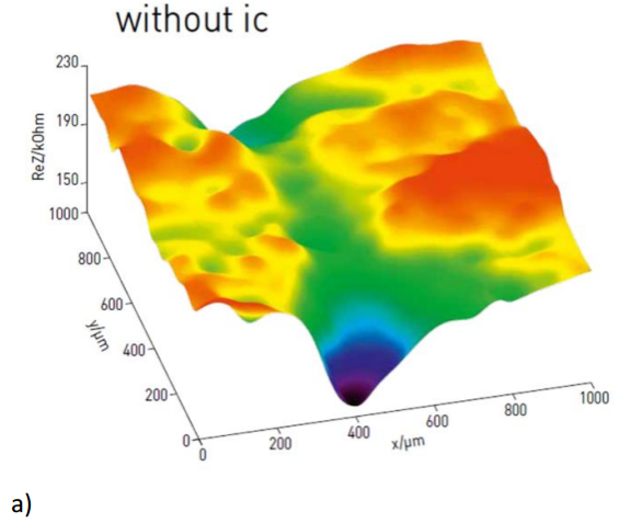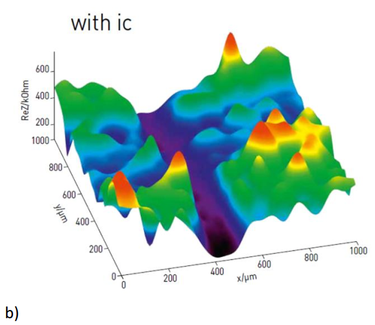 图9b)中,垂直方向和水平方向的凹槽都能看到,这种差异不是形貌产生的,而是基底比氧化层更导电。而且,ic-SECM具有更好的对比,比如其阻抗响应区间更广。