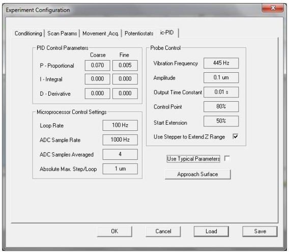 用户可以通过图3所示的ic-SECM面扫描实验参数设置窗口设置ic-PID的参数。ic-PID可以设置ac表征后用到的频率、振幅ΔZf和控制点(确定的振幅百分比)定义ΔZset。其他参数的更多细节参见用户手册。