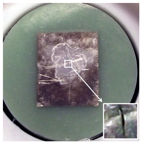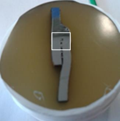 图7 ic-SECM实验后的带划痕7075样品。白色方框区域为分析区,有划痕。