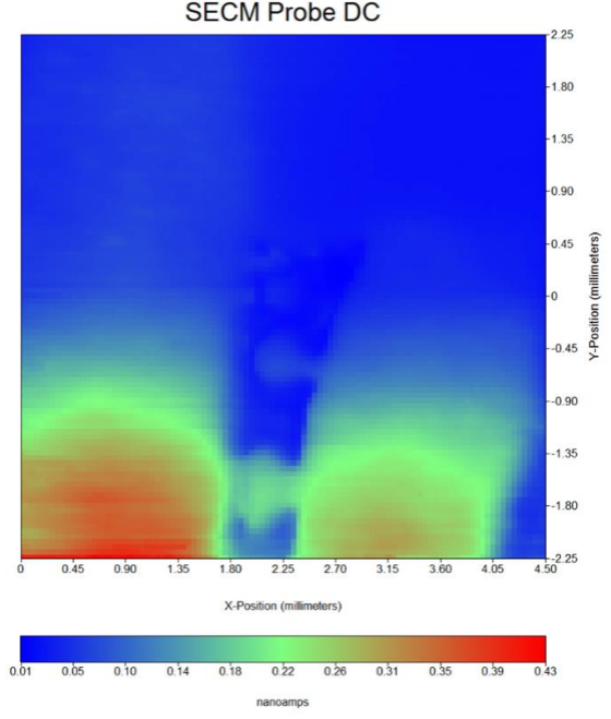 本文介绍了ic-SECM在腐蚀研究领域的优势。焊接钢样品实验中,ic-SECM的优势是进行较大区域的扫描(实验中为20mm2),而没发生探针与样品的碰撞。Al样品实验中,ic-SECM的优势是更清楚的表征样品表面的反应差异,而排除形貌的影响。两个案例中,由于探针非常接近样品,探针尖端的信号增强。