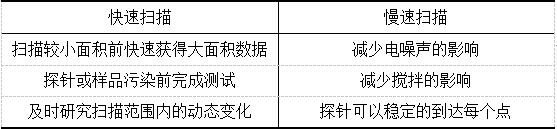 有些用户可能需要尽量快速的面扫描,而另一些用户可能希望牺牲速度获得最好的测试结果。虽然SECM150可以提供较大的扫描速率范围来满足客户的需求,也需要用户进行一些尝试,获得最佳的实验设置。表1是快速扫描和慢速扫描的对比。
