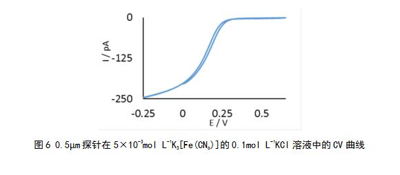 与直径≥10?m的毛细管探针不同,直径≤5?m的探针不能进行机械抛光。这种直径较小的探针机械抛光过程中很容易破坏探针尖端。而且,直径较小的探针是由铂丝拉成的,探针尖端是逐渐变细的,机械抛光会改变探针直径和RG值。然而可以通过电化学方法原位清洁探针。本文的实验中,可以通过动电位极化,在-1.5V~1.25Vvs.SCE快速扫描的方法来清洁探针,重复多次,直到探针回到开路电位。根据CV结果来选择电位区间。PC1测试采用的0.5?m探针在5×10-3mol L-1K3[Fe(CN6)]的0.1mol L-1KCl溶液中的CV曲线如图6所示。注意,溶液中溶解氧的存在使得CV的基线接近-0.25V,扩散不平衡。探针尺寸不同,确切数值也不同,与本实验一致的氧化还原介质浓度和探针,清洁后,测试结果基本形状应与图6一致。