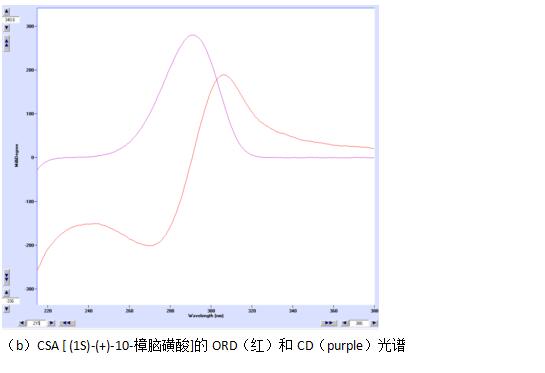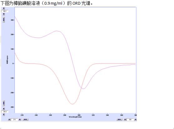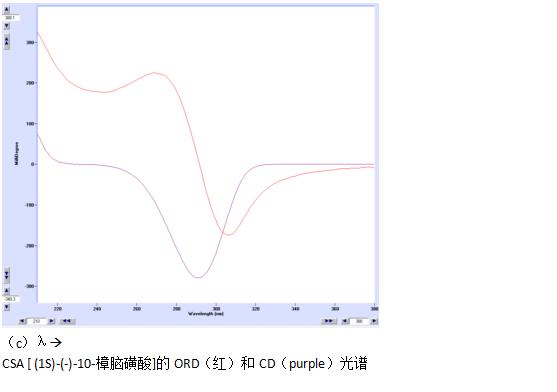 图2. 1 cm比色池中装CSA [ (1S)-(-)-10-樟脑磺酸]水溶液(0.9 mg/ml)的CD和ORD光谱。每个光谱都是由MOS-450或MOS-500测的,图的扫描时间只需数秒。
