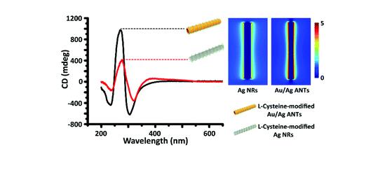 贵金属纳米结构与手性分子的耦合在紫外-可见光谱范围内产生了强烈的手性光学响应。本文通过半胱氨酸与Au/Ag纳米管偶联,制备了半胱氨酸修饰的Au/Ag合金纳米管(ANTs)。手性反应强烈依赖于半胱氨酸的手性,表现出明显的镜像行为。与Ag-或Au-半胱氨酸手性杂化纳米棒相比,半胱氨酸修饰的Au/Ag纳米粒子具有更高的手性光学响应。诱导的CD信号出现在Au/Ag ANTs的带间吸收区而不是局部表面等离子体子带,这既可以归因于Au/Ag蚂蚁表面延伸的螺旋网络构象,也可以归因于等离子体纳米管的近场增强效应。这证实了库仑相互作用诱导了半胱氨酸与Au/Ag ANTs之间的偶联,使得半胱氨酸分子在Au/Ag ANTs表面形成一个扩展的螺旋网络。此外,半胱氨酸修饰的Au/Ag ANTs由于手性活性中心的存在和大基团的空间效应,在催化电化学反应中对氨基酸也表现出良好的手性识别性能。