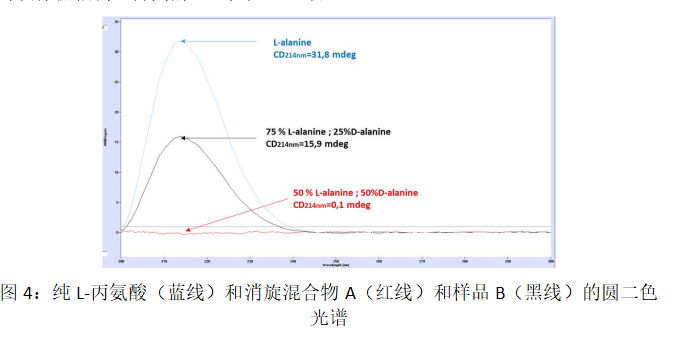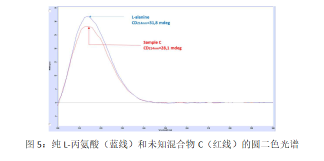 样品C的最大圆二色光谱信号为28.1 mdeg。该圆二色光谱对应于94.2%的L-丙氨酸和5.8%的D-丙氨酸的混合物。