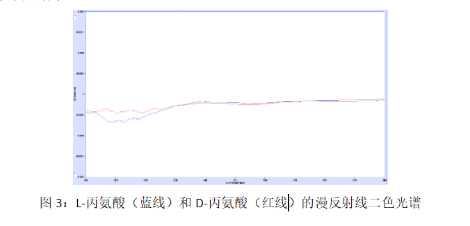 漫反射线二色的信号强度中,L-丙氨酸的低于0.0008 △A,D-丙氨酸的低于0.0005 △A,这样的强度对CD测量几乎没有影响。与其他制造商报告的值相比,我们设计的仪器更好,线二色效应对比其他机器小4-5倍。