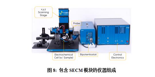 如图8所示,SECM由许多部件组成。为了满足x,y,z方向的扫描,SECM都有一个x,y,z扫描平台,能够达到最高分辨率测量所需的亚微米级步长。虽然反馈模式只要求探针有偏压,需要一个单一的恒电位仪测量,但SECM在其他模式下进行时,也要求样品作为第二工作电极有偏压。因此,SECM都使用双恒电位仪。样品放置在工作台上的一个电化学电解池中,为调整样品的倾斜度做了准备。最后,SECM需要使用UME探针,其通常作为测量中的主要工作电极。
