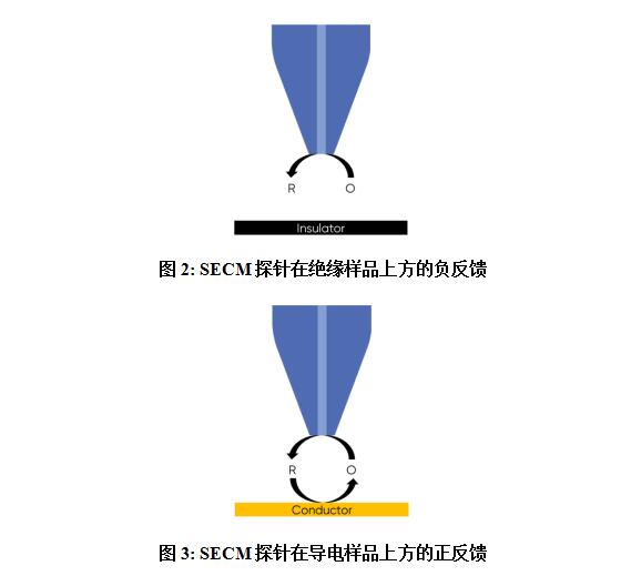 当偏压的UME探针与绝缘样品接近时,出现负反馈,氧化还原介质向探针的扩散受阻,如图2所示。这导致探针测得的氧化还原介质浓度较低,因此测得的电流比溶液中的电流低。当SECM探针位于导电样品上方时,样品充当双极电极,即使没有偏压,也可以循环探针下方区域的氧化还原介质,如图3所示,并局部达到能斯特平衡电位。这种介质循环导致探针检测到的介质浓度局部增加,进而导致测量电流增加。