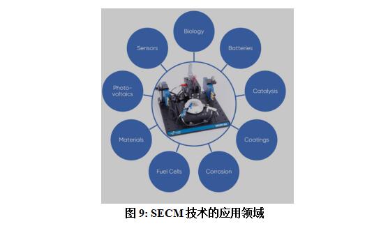 SECM可用于任何由宏观电化学测量的系统,其中局部电化学特性是有意义的,图9为一些已使用SECM的领域。由于其广泛的适用性,SECM已被广泛应用于很多领域,包括: