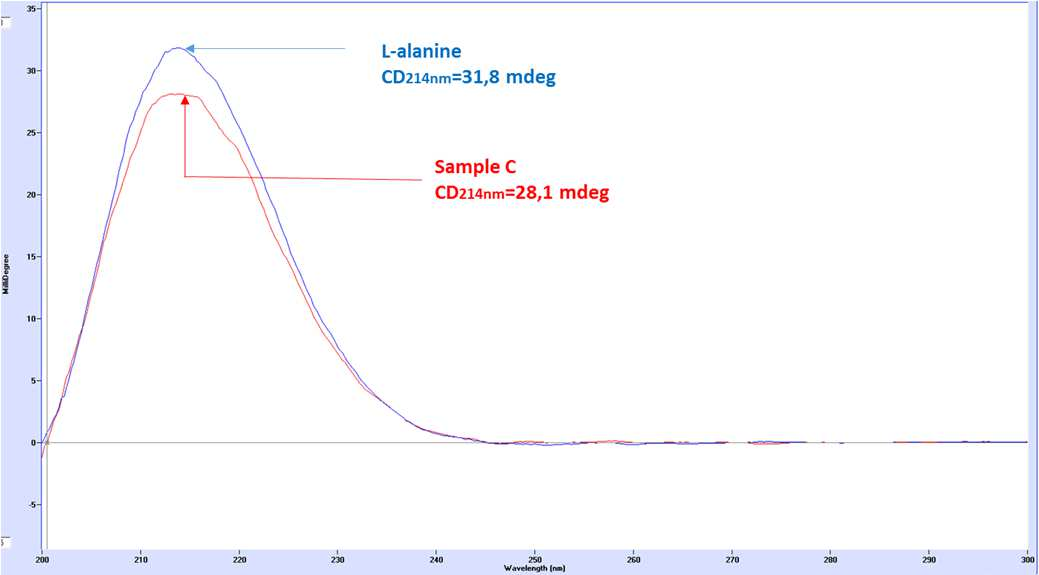 样品C的最大圆二色光谱信号为28.1 mdeg。该圆二色光谱对应于94.2%的L-丙氨酸和5.8%的D-丙氨酸的混合物。