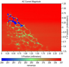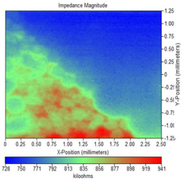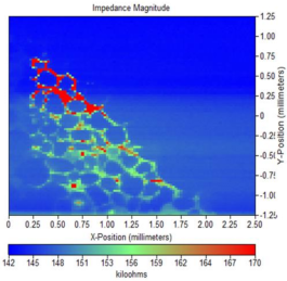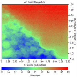 SECM测试也可以在ac模式下进行。与dc-SECM不同,这个技术不需要氧化还原介质或者电解质盐。这个技术特别有利于测试那些需要避免样品与环境相互作用的实验。dc-SECM测试的信号与样品类型有关。对于绝缘样品,当探针与样品的距离减小时,阻抗增大。而对于导电样品,信号取决于测量频率和溶液电导率。当测量频率较低或者溶液电导率较高时,随着探针到样品的距离减小,阻抗增大。当测量频率较高或者溶液电导率较低时,随着探针到样品的距离减小,阻抗减小。ac-SECM测试提供了样品形貌和电化学活性两种信息。