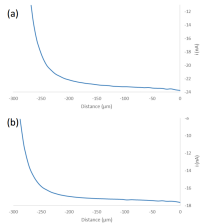 图2 Si晶片(a)和Si纳米管(b)的典型逼近曲线结果。随着探针与样品的距离减少,电流降低。
