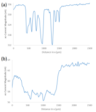 另一方面,自来水中的测试结果显示了比5 mM [Fe(CN6)3-/[Fe(CN6)]4- / 100 mM KCl溶液中更多的特征。也注意到,dc-SECM测量中,当采用ac-SECM在自来水溶液中测量纳米管阵列时,可以看到单胞周围具有更高的电化学活性,而这种特性在5 mM [Fe(CN6)3-/[Fe(CN6)]4- / 100 mM KCl溶液中同样的测量中并不明显。图6中对比了相似区域的测量的截面。比较发现虽然两种系统显示了黑色带状区域的活性的相似的改变,在自来水中黑色带状区域的空隙和峰值处,活性的改变减小。